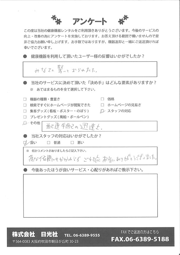 当社ではお客様へ健康測定機器を発送する際に、今後のサービスの向上、改善の為にアンケート用紙を同封させて頂いております。 また新規のお客様に当社のサービスをより知って頂く為に、お客様の声として公開させて 頂いております。 当社でも日々サービスの向上を目指しておりますので、是非ご参考に頂ければと思います。 まだまだ、アンケートにお答え頂いた数が少ないのですが、多くの喜びの声を掲載できるよう努めていきます。 |